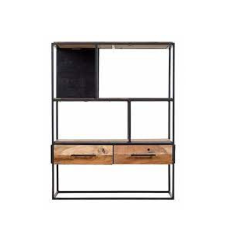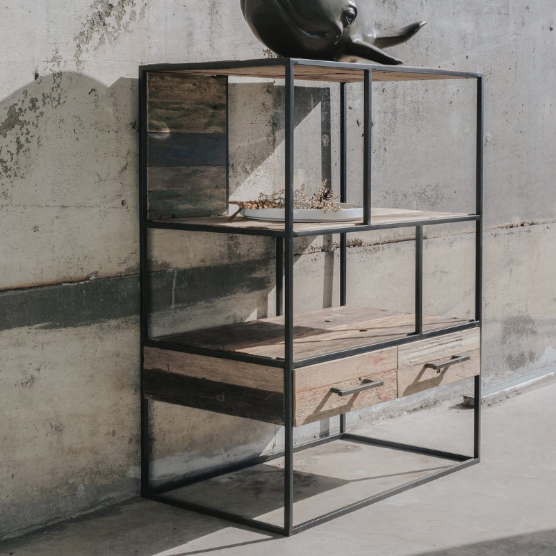 Bois de bateau recyclé et mindi massif, structure métal thermolaqué.